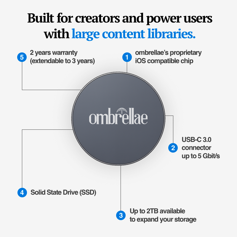 Transfer anything, from full video libraries to massive photo backups, in seconds. Ombrellae supports up to 5Gbps via USB-C, and up to 480Mbps through Lightning.