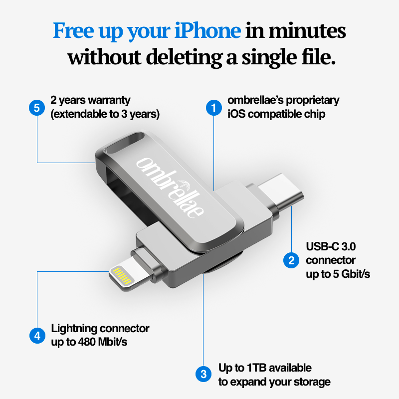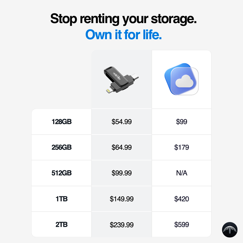 *based on 5 years usage, compared to iCloud, Google Drive, OneDrive & DropBox (2025 prices and history of storage capacity subscription plan on average and equivalent compared to our one-time payment ombrellae products)